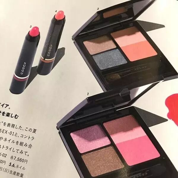 日本地区的则是典型日系甜美风格的腮红眼影混合盘。日本地区的彩妆盘分别是粉色盘EX01立夏辉和橘色盘EX02夏夕暇,定价7000日元;唇笔EX01凉红和EX02艳珊瑚,定价4000日元;指甲油5月1日发售。