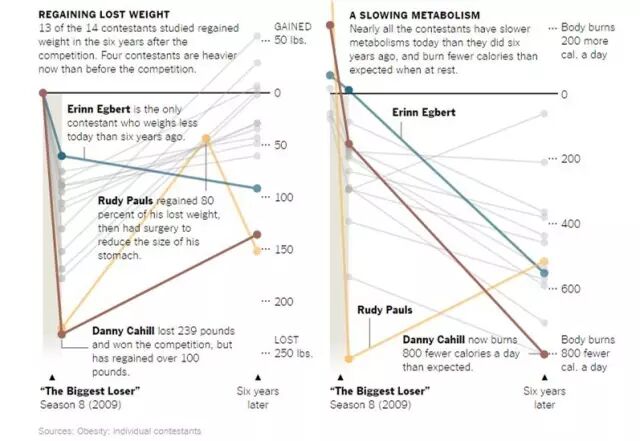 最惨的是,掉下去的体重反弹了,掉下去的静止代谢率(resting metabolic rate)却没反弹——这些人基本得每天少吃一顿饭,才能阻止自己继续发胖。