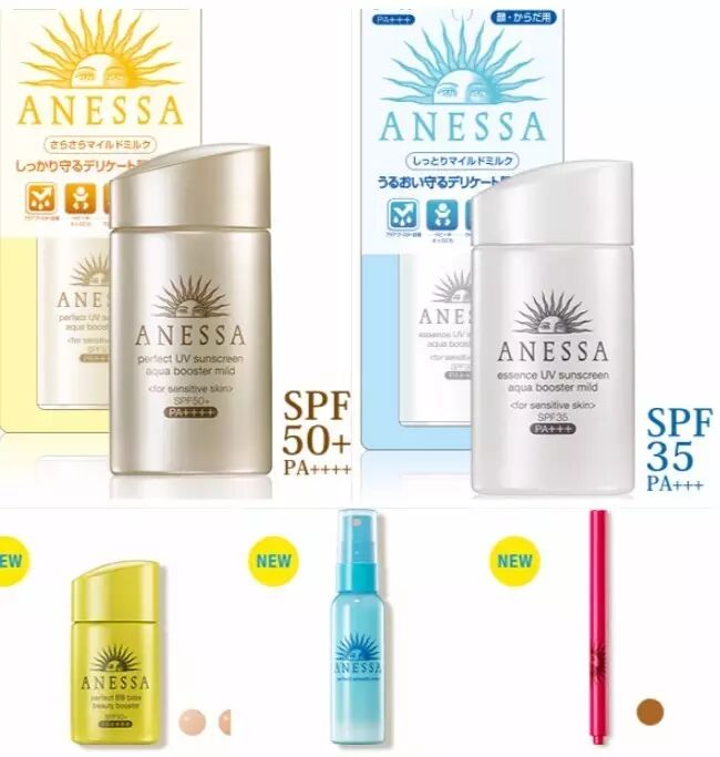 2017年安热沙在防晒上新增金瓶for敏感肌(网上人称粉金瓶)、银瓶for敏感肌(瓶子类似珠光白色)、BB霜(也可以做妆前乳“化粧下地”)、定妆喷雾、眉笔,一共5款产品。