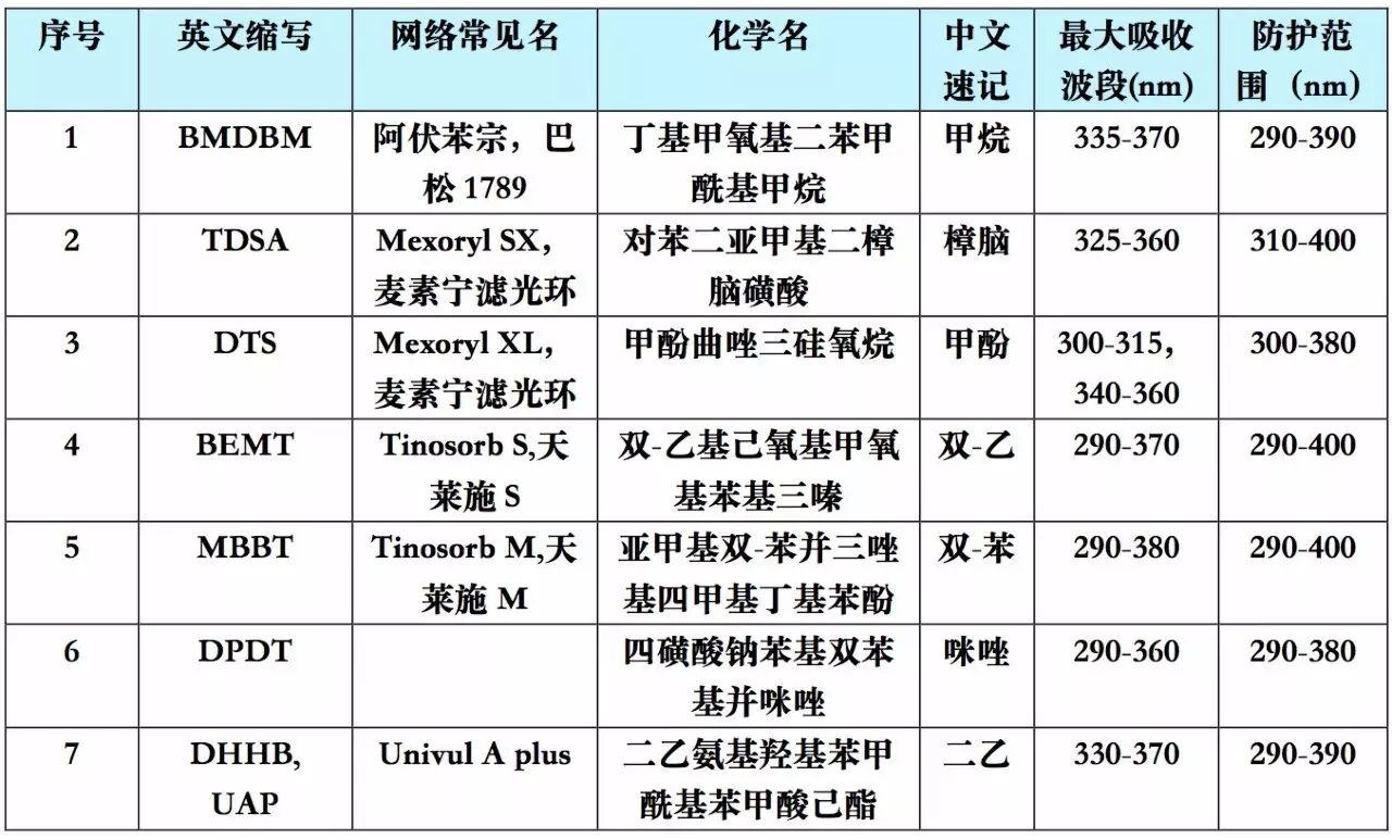 按照惯例,先复习下常见UVA防护剂的英文缩写,下文用得到。