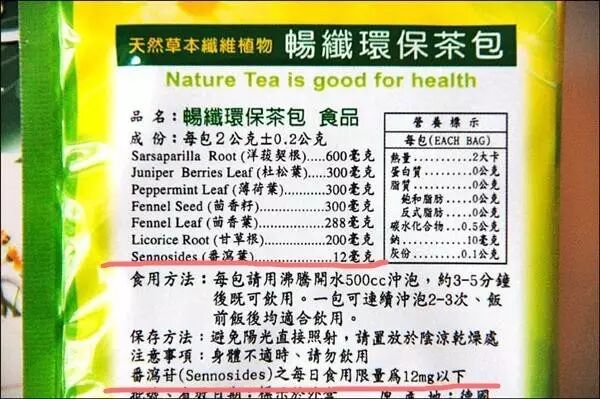 这种名为“环保茶包”的减肥茶后来被爆出,每包减肥茶含有17.9毫克番泻叶,超出台湾地区标准。