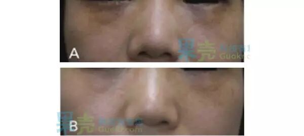 真皮黑素细胞增多造成的色素型黑眼圈。A)治疗前; B)Q开关翠绿宝石激光治疗后