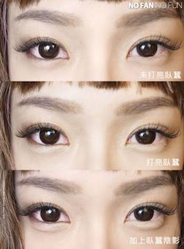 网上能够找到相当多的画卧蚕教程,总结来说就是用亮色彩妆品——比如浅色眼影,浅色眼线笔——在下眼睑下方卧蚕会出现的位置打亮,制造凸起的效果,还可以用修容色在卧蚕的下沿画出一道线条,模拟出卧蚕下的阴影。