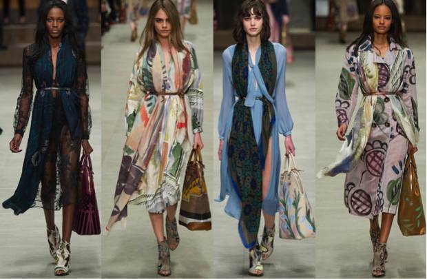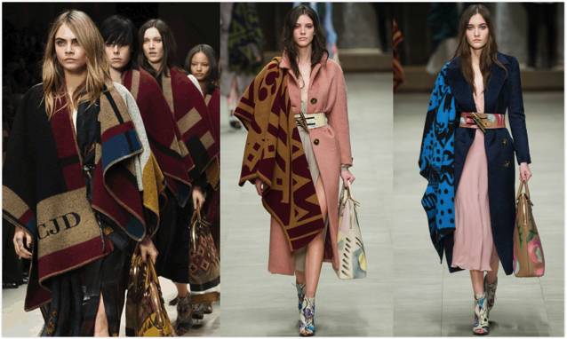 披肩式围巾一般比较宽大,有许多被设计为正方形。以Burberry2014年秀场上的披肩围巾为例: