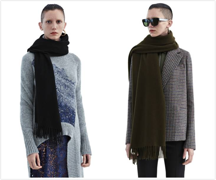 一条oversized的纯色大羊毛围巾,随意地或挂或裹在脖子上,是欧美街拍里最常见的形象之一。Acne的纯色羊毛围巾很有名,我们用它家的产品举个例子: