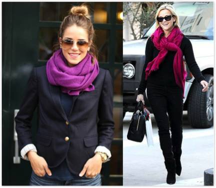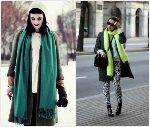 除了上面那些基础的素雅色系,亮色围巾选择恰当也能很出彩。绿色围巾也很美哦,比如蓝绿色(teal)和深绿色就很显白,还很有文艺范儿。荧光色围巾搭配起来就要难一些,一定要注意总体的配合,比如上图右的内搭和裤子就都是和围巾的亮度相当的荧光色/花瓣色,再用深色大衣和包包进行平衡,整体才显得时髦个性而不俗艳。