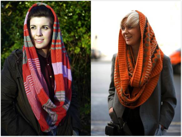上图左边两个妹子戴的snood简洁帅气还能显脸小,右边的款式则比较复古优雅,有信心走复古lady路线的妹子可以尝试。总的来说,质地比较厚实有型的围脖当头巾戴起来会更有修饰作用。