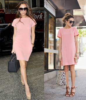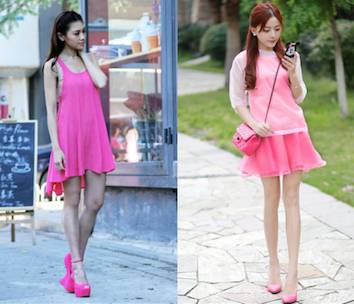 从头到脚都是粉色的穿搭,就有点粉过头,看着不会非常舒服。比如下图的搭配,左边裙子和鞋统一的热粉色,右边是不同的相似粉色搭配在一起,非但不小公主,反而俗俗的。