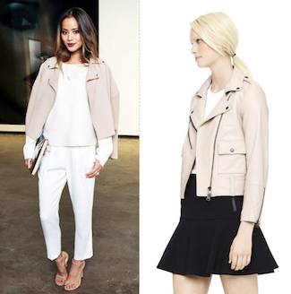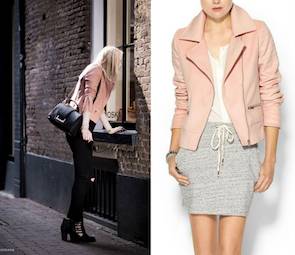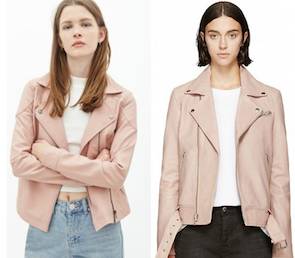 一件合身的粉色系机车夹克,时髦百搭,兼具帅气和柔美。皮质的能够在较凉的季节穿着,如果穿的机会比较多,可以投资一件,能穿上几年的。比较温暖的地方可以考虑比较便宜的雪纺和棉质面料。
