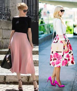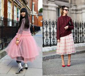 飘飘的纱纱蓬蓬裙,每个少女的心底里多少还是有着一丝喜欢的吧。如果无法接受太过少女和高调的设计,图右的类型就是不错的选择。长度较长,蓬度适中,材料不太轻飘,花样简洁,深色的上衣和尖头高跟鞋让整体变得成熟,ladylike中带着不做作的少女感。