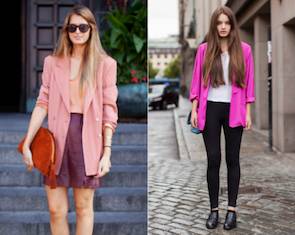 这种属于不笔挺但是有垂坠感的,风格更加休闲,出去玩儿或者上课都很好穿,即不拘束又有型。看到右图有人可能会讲,不是说好不说热粉色吗!但是穿着好看就是王道,图中的搭配非常和谐,版型简单的亮粉色西装外套让这套本来普通的穿搭有了看头。