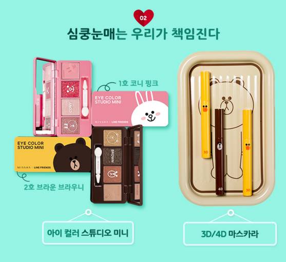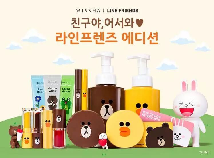 2015年12月,韩国著名社交媒体Line和韩国彩妆品牌Missha推出合作限量,包括了唇彩、眼影盘、气垫BB 、睫毛膏、染唇液,还有洁面慕斯、护手霜,布朗熊和可妮兔萌死你不偿命。