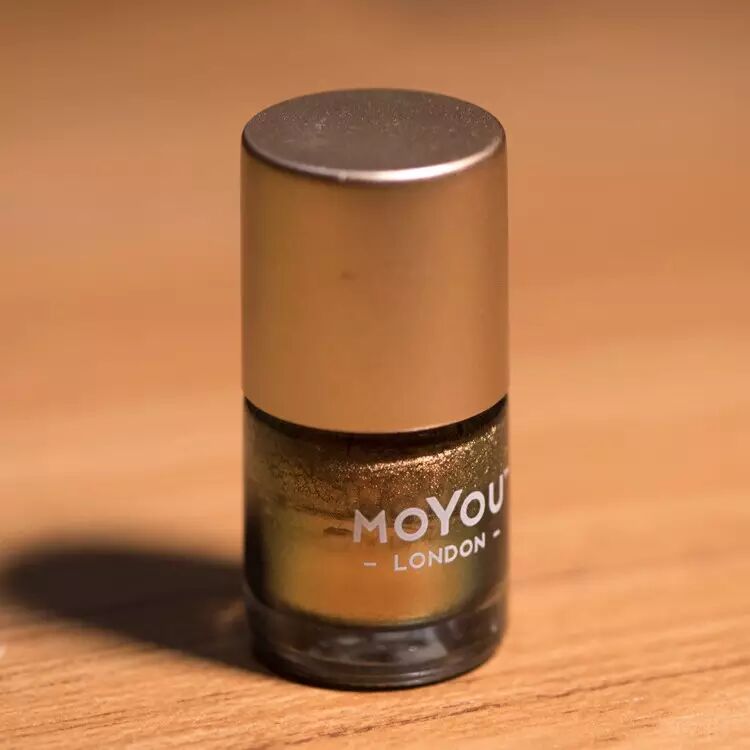 1. 首先涂抹金色甲油。这类颜色比较容易涂出刷痕,下笔要轻。优点是干得特别快。金色薄涂两层,因为薄涂两层比厚涂一层更容易涂均匀。因为后面要黏贴纸,还需要在此之上再涂一层顶油,以防贴纸把底色带起。