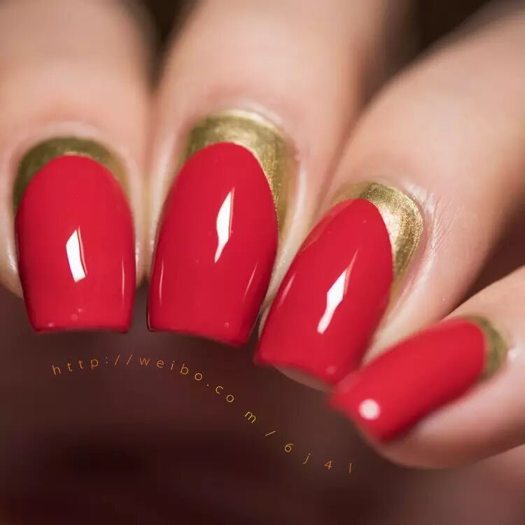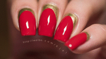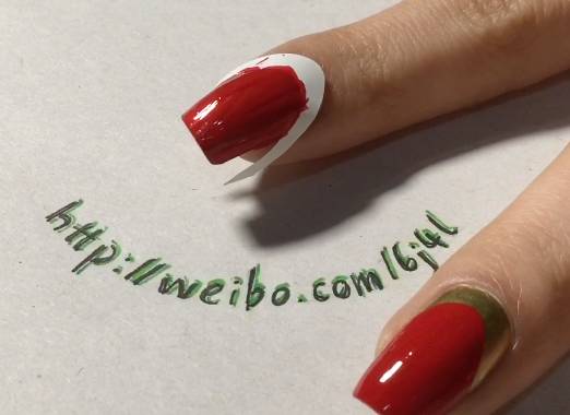 3. 直接用红色甲油(Deborah lippmann色号20054)涂在遮挡好边缘的指甲上。如果是造型比较复杂的遮挡贴纸,或者编织而成的金银线,推荐用海绵上色。涂匀之后,直接撕掉贴纸。甲油一旦干了,不管是全部干透还是表面干透,都会成膜,再撕的时候很难撕出光滑的边缘。