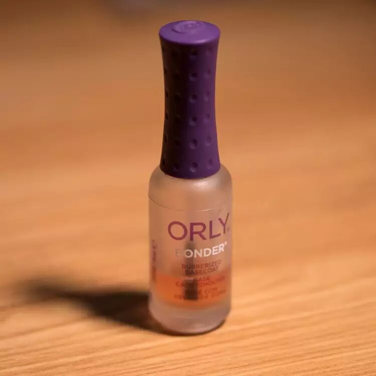 金属色属于特别容易脱落的一类指甲油,推荐使用防脱落效果好一些的底油。这里用的是ORLY Bonder邦德粘合底油。这类底油可以使彩色甲油紧密粘合指甲表面,橡胶天然的拉伸弹性包裹住指甲,良好的粘合性防止甲油开裂脱落。