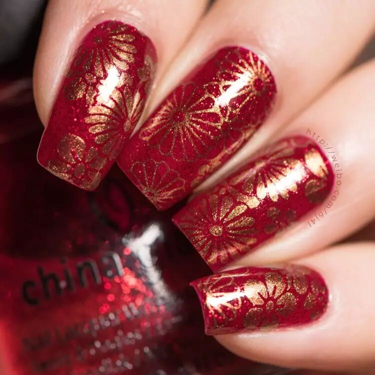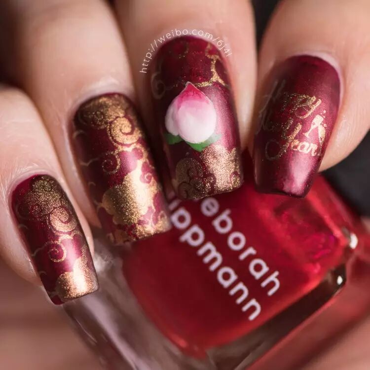 1. 先涂底油和底色,底色用的Deborah Lippmann的through the fire和newyorkskare混合,涂了磨砂顶油,做出红色丝绸的效果。做彩绘是一定要用磨砂打底的,不然丙烯颜料画在上面容易凝结成滴,后面涂顶油也要用磨砂顶油,不然容易起皱。