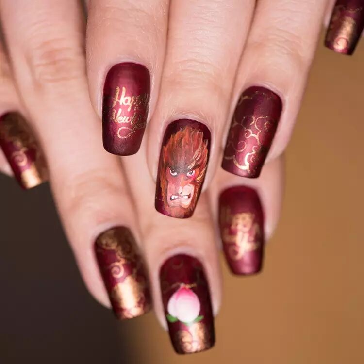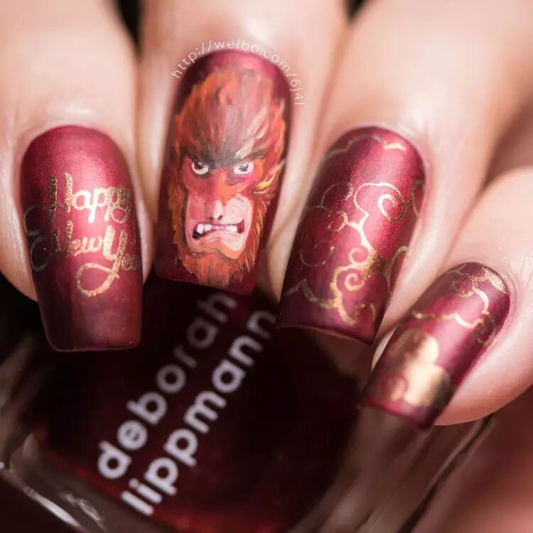 彩绘。其实现在贴纸啊印花种类这么多,这项技能并没有什么太大的用处,但是偶尔有买不到的贴纸、没开发出来的印版,还是要拿出来玩的。猴年依然画大圣归来里面的大圣。指甲上画男神蛮微妙,特别是做一些比如抠鼻之类的事情,会看到大圣的脸……