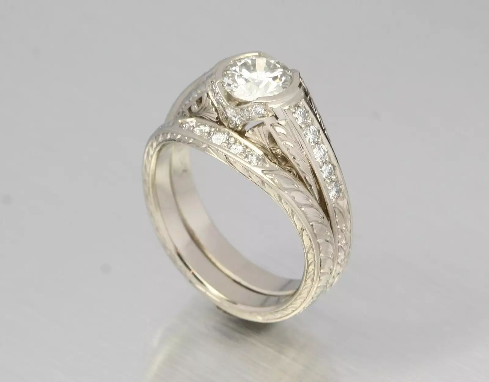 铂金订婚戒指结婚戒指套装。为了考虑搭配佩戴的效果,结婚戒指的部分做了弯曲弧度处理。图片:weddinghouse.info