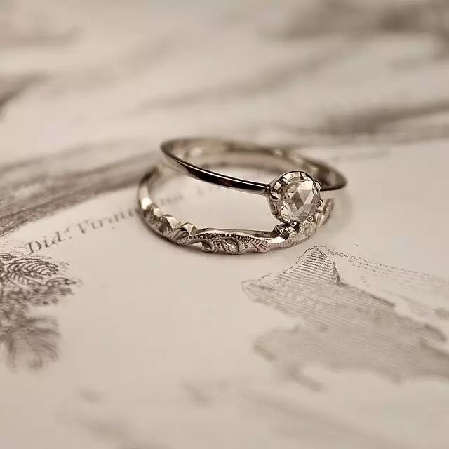 花叶金属圈婚戒用来搭配复古的rose cut钻石婚戒,逼格更上一层。图片:deerpearlflowers.com