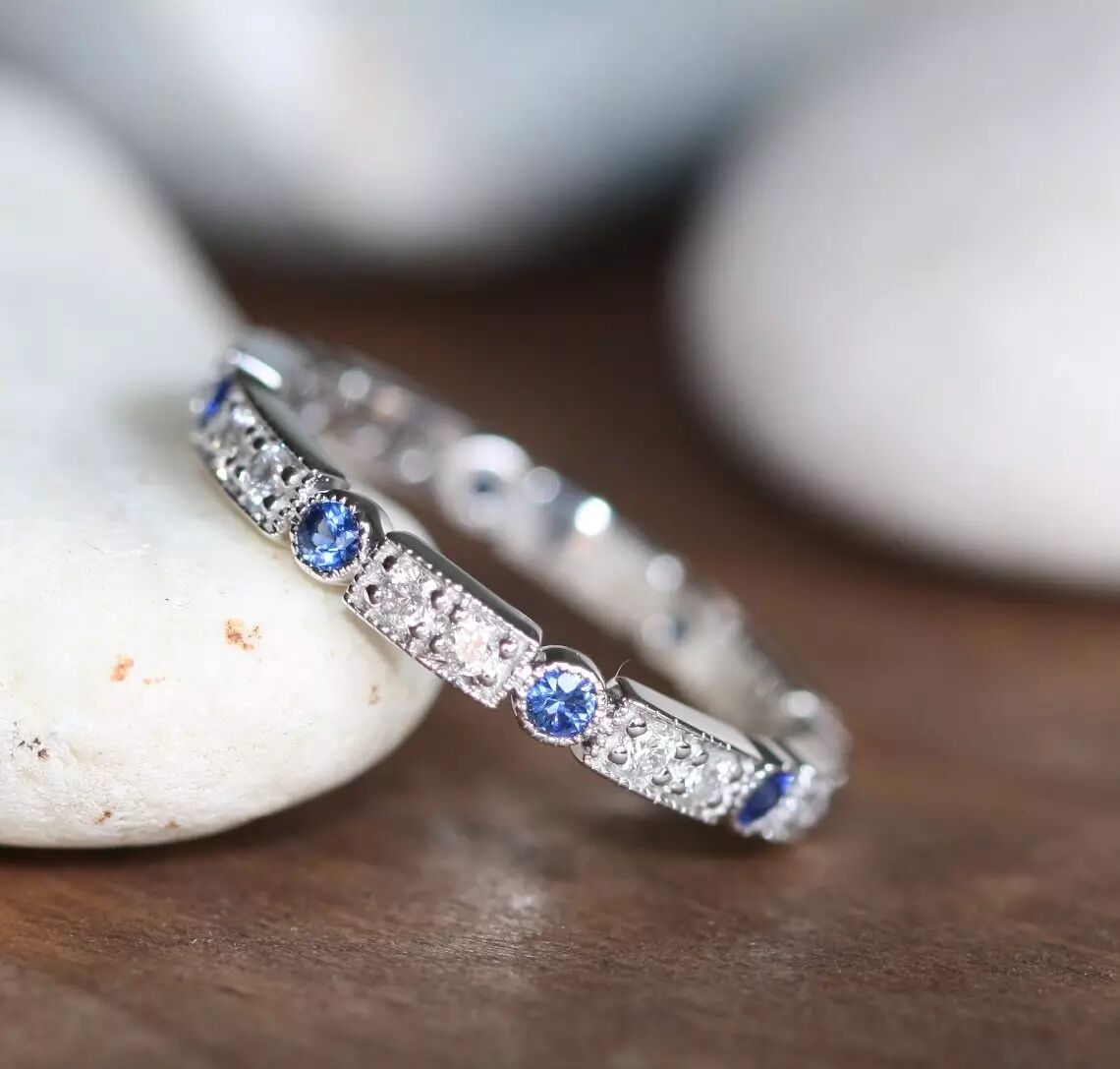 14K金镶嵌钻石蓝宝石永久圈婚戒。图片:etsy.com