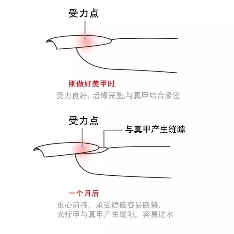 光疗胶维持三周左右才是比较正常的情况,过长或过短都不好。过短通常是因为美甲前护理不充分、产品的不当应用和维护。但保持时间过长,自然指甲已经长长,而光疗甲的弧度形状还维持原状,就会更容易造成断裂和起翘,起翘进水的话有时还会引起真菌感染。