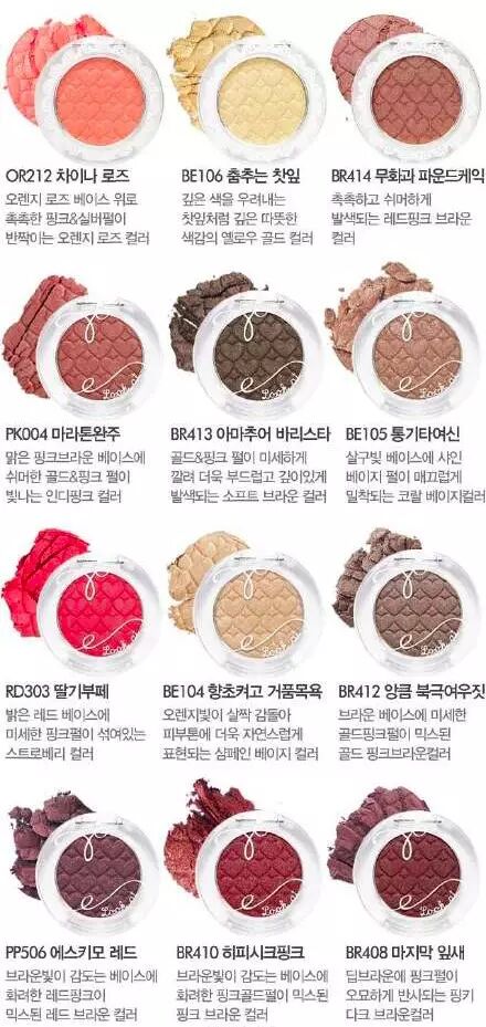 ↑爱丽小屋单色眼影,平价好用,颜色种类多,大多适合日常。是韩国pony大神常常爱用的眼影哦~随便一个色号拎出来基本都可以单用!比较热门的色号有橘粉色OR208,嫩粉色pk005等等。
