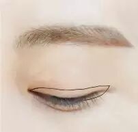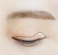 首先如下图所示,使用工具沾取少量眼影,于眼睑轻轻铺色一层。并用干净的手指或者工具在眼影边缘部分轻扫,使其边缘过渡更加自然。