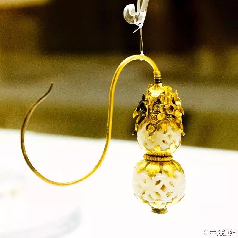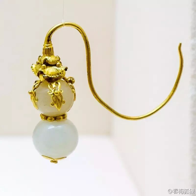耳饰其实还有一个优点,很多饰品的材质上会有一些等级限制,而这里面耳饰是最宽松的。所以当时女子几乎都穿耳,还有一些男孩子也会穿耳。明代耳饰的特点很显著,就是它用来穿耳的弯钩是一个很夸张的∽型(虽然常见博物馆把那个钩子掰直了),并且偏爱葫芦、灯笼之类的题材。