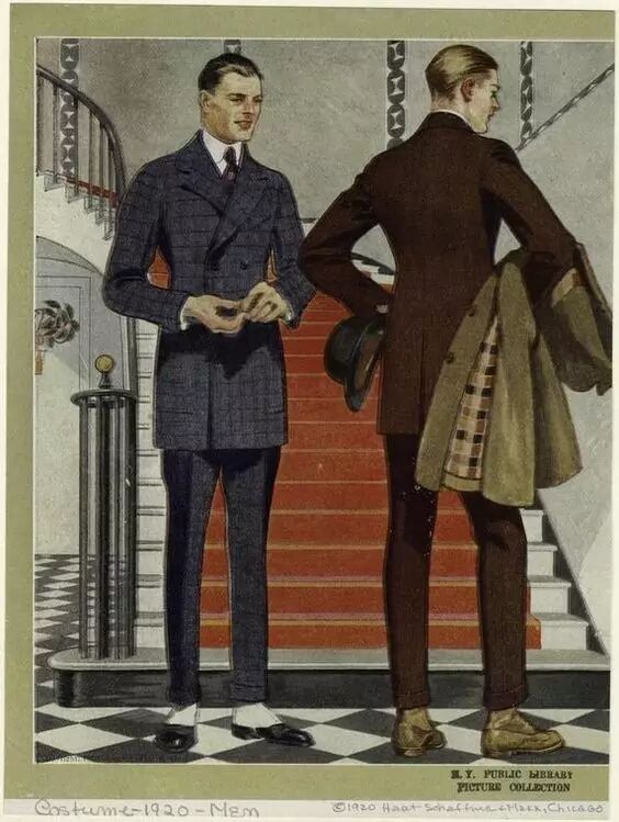 这是一张 20 年代初的男装广告画,对照一下影片中纽特的衣服的合体度,我们可以发现二者取向上非常一致,尤其是裤子的宽度——反正绝不是如今“韩式西装”那种紧绷绷的裤筒。片子的背景是 1926 年,虽然比这张广告晚了6年,但是要知道,那个时代衣物的更新周期是非常长的,所以一个普通阶级的成年人的衣物像比较早的时期,符合当时的事实。