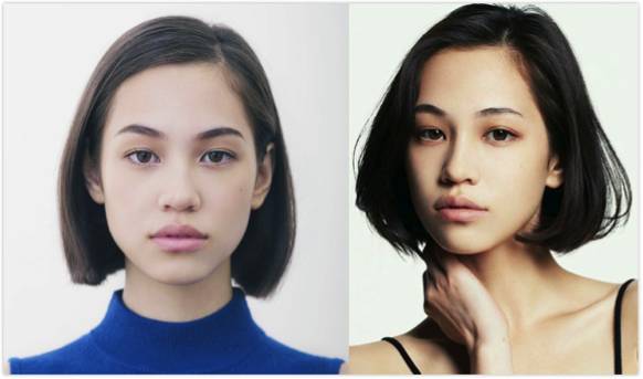 上图姑且让我称作造型前后对比图。左边可以算得上是干净整齐,但是尽管配的是日本名模水原希子的脸庞,也没有太多亮点;若是搭配普通人,那不是刘胡兰就是马大姐了。然而右图将头发做出了内卷的自然蓬松弧度后,路人马上变型人。