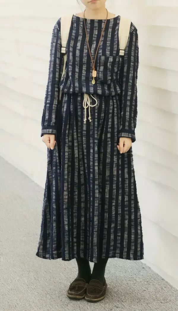 直筒裙分两种,一种是棉麻质感纯色系,一种有大量的条纹、格子等印花。不管哪种花色款式,它们的最大共性都是同一点,叫做没有腰: