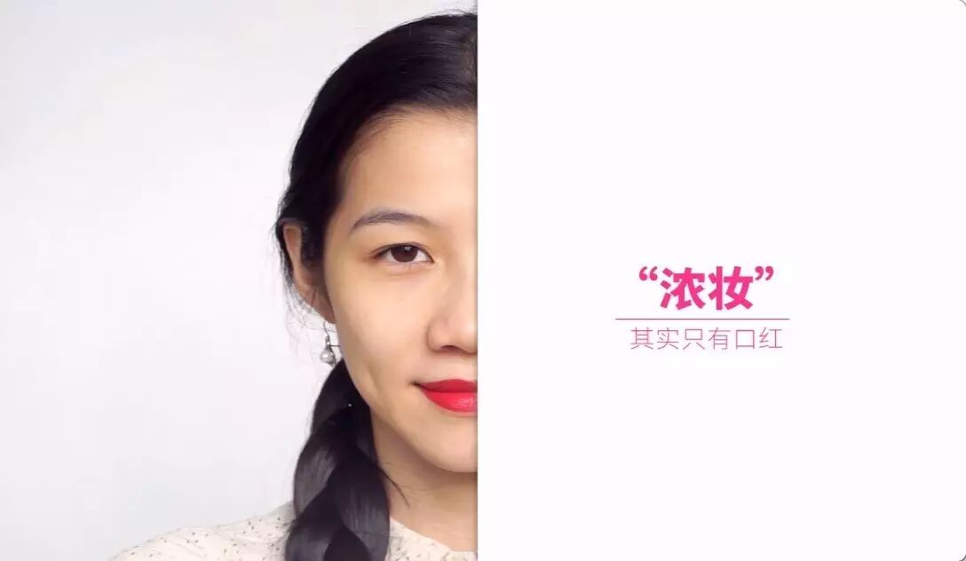 网络上有一句非常经典的吐槽:只要画个大红唇,哪怕你其他啥也没画,直男也会觉得你画了浓妆;而粉底+修容+腮红+眉毛+眼影这种全套上脸,只要唇膏颜色不显眼,你就是没化妆。