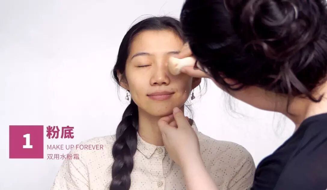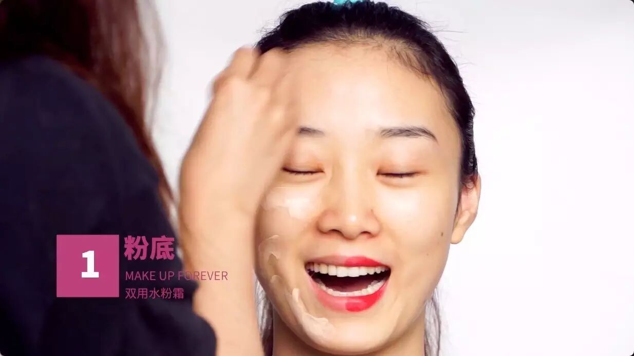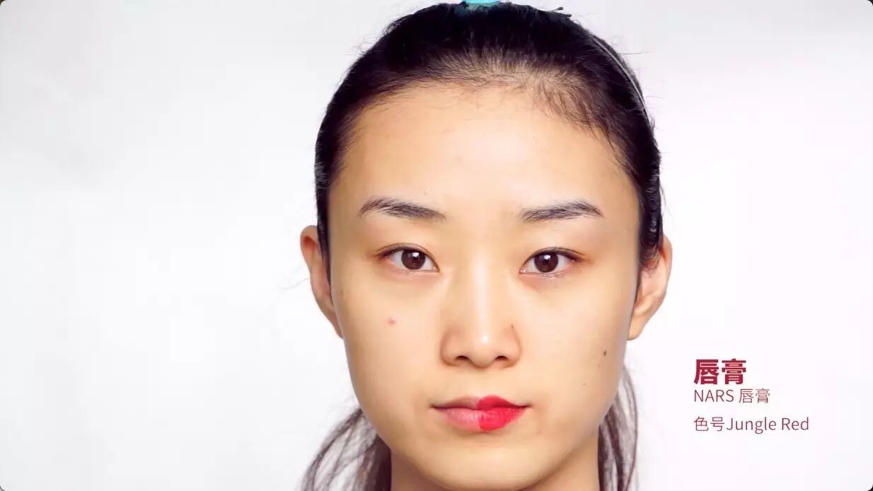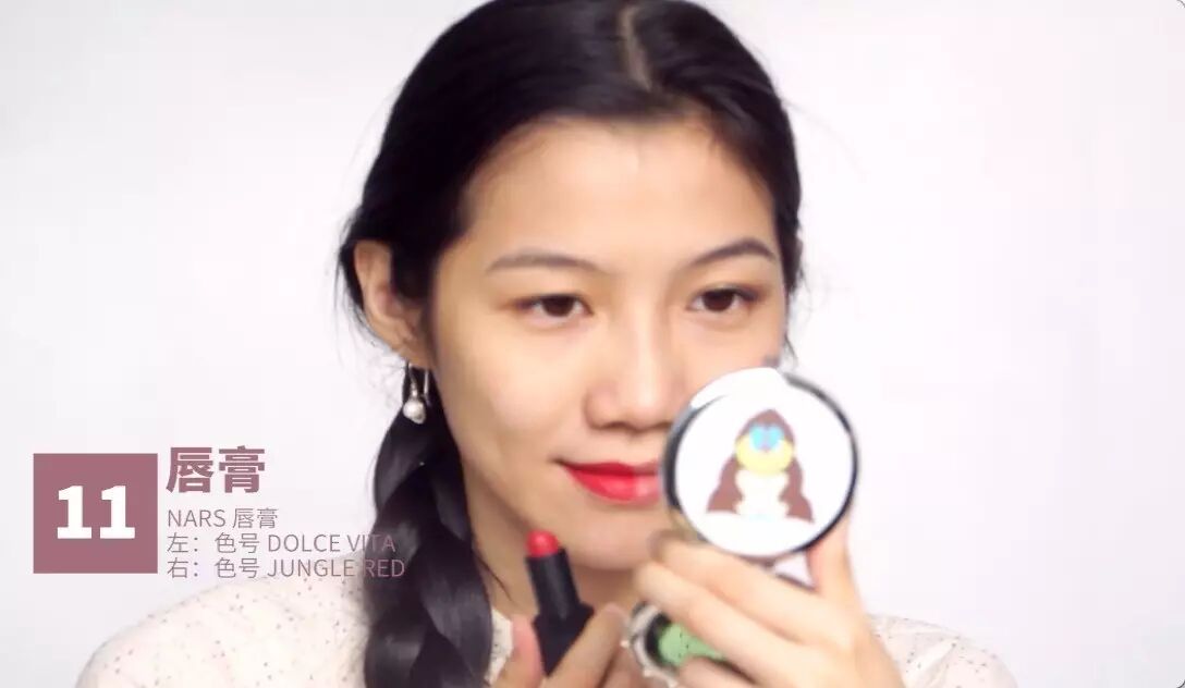 测试方法:两位妹子半边脸画全妆,半边脸只涂大红色唇膏。