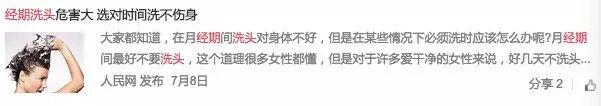 但周围的人或者父母长辈都在告诫我们:月经期间不要洗头。还说不洗头,不是冷不冷的问题,是会导致子宫收缩不完全,应该排出的污血未排净,而残留在子宫之内,日积月累,而使体内荷尔蒙分泌不平衡,长久累积而致癌。微博上也多见这样的信息: