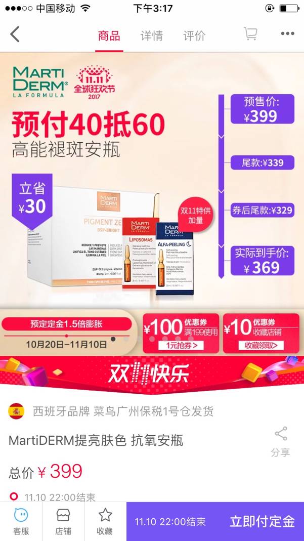 liposomas抗氧化美白,alfa-peeling去角质控痘提亮肤色。旗舰店原价717元,现在预售价是399,MartiDERM旗舰店的活动是预付定金40元抵60元,关注店铺可以领取10元无门槛抵用券,最后套装到手的最低价预计是369元。