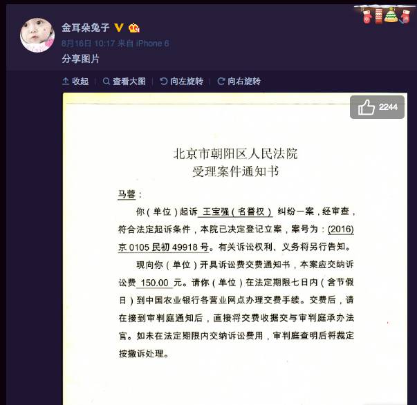 北京朝阳法院官方微博显示在王宝强立案的第二天,马蓉就委托律师立案的名誉侵权案件。
