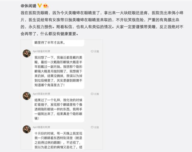 老太这种堆积27片在眼睛里的,确实是奇闻。但小规模的隐形消失事件并不罕见。去年11月,就有微博大V表示戴美瞳碎在眼睛里了,并表示“大家一定要谨慎带美瞳,反正我绝对不会再带了,什么都没有健康重要”,还附上了一位粉丝发给她的私信,里面提到她佩戴的隐形眼镜竟然转到了“眼睛不知道哪个角落”,还在里面呆了半年……
