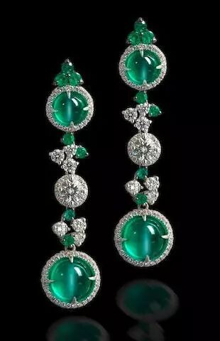 绿色碧玺猫眼、祖母绿、钻石耳环,图片来源:bonhams.com