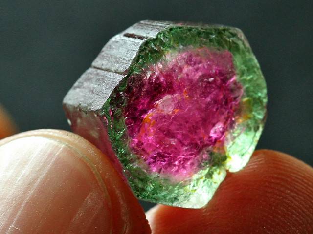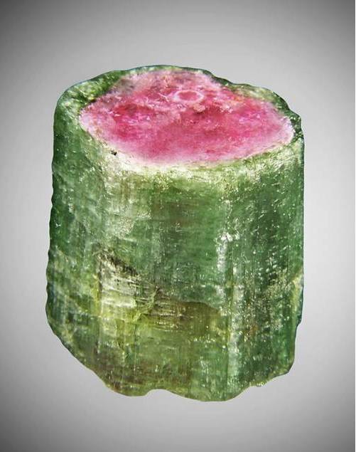 碧玺色带十分发育,常在一个晶体上出现多种色带,形成多色碧玺。萌萌的“西瓜碧玺”就是在一个柱状晶体上发育内红外绿两种色带的多色碧玺。