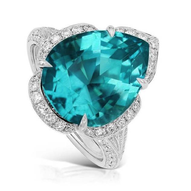 颜色美到让人流眼泪的帕拉伊巴,摄人心魄。其中含有的微量铜元素与锰元素,造就了其蓝-绿的迷人色调。它最先被发现于巴西的帕拉伊巴州,并因此而得名,不过现今的主要产地为莫桑比克与尼日利亚。帕拉伊巴产量不多,且大颗的十分罕见,所以这价格是理所当然的昂贵咯,下面这颗11克拉的梨形宝石,标价33000多美元。
