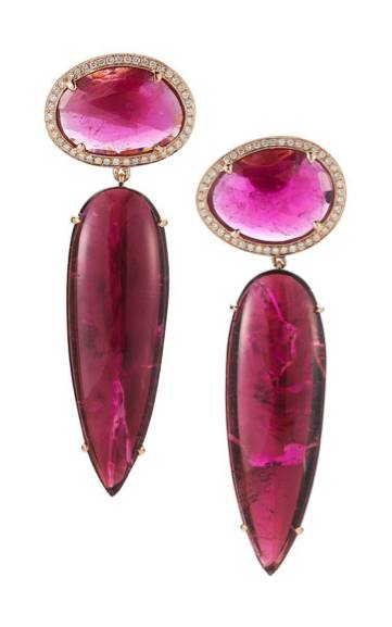 粉色碧玺(上部)、钻石、卢比来(下部)耳环,图片来源:modaoperandi.com