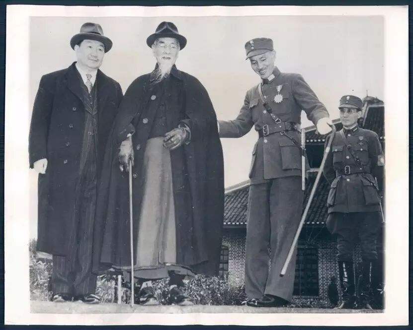 张大佛爷上面戴的是大盖帽,不过应该用普通的平顶帽更合适。我们看两面两张出现的老蒋童鞋,站在老婆边上的时候,穿着的是翻驳领的军礼服,所以他搭配了大盖帽。而他穿斗篷的时候,应该在下面穿的是和大佛爷类似的立翻领军装,也就是类似中山装款式的军装。