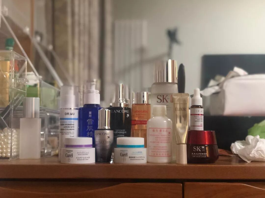晚上洁面之后SKII神仙水-SKII大红瓶-ELIXIR眼霜;或者,DR. WU杏仁酸-雪肌精乳液-珂润面霜(一次买了两款,一个普通版本一个抗老的,换着用)。城野医生化妆水每周用化妆棉敷脸蛋子。