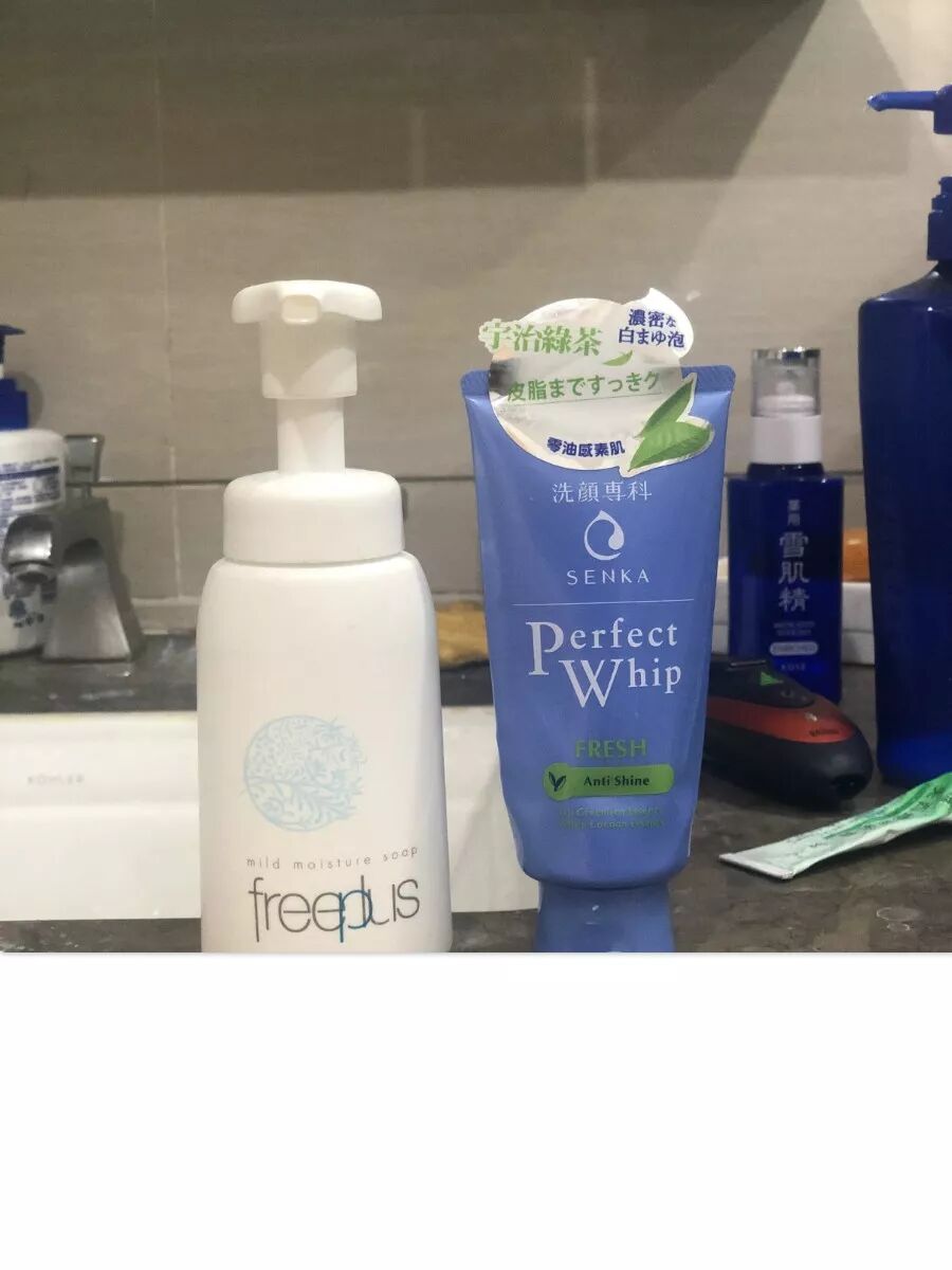 晚上卸妆之后用清洁力比较强的蓝色的那个,每次洗完脸都很干,之后就接着瓶瓶罐罐润肤了。