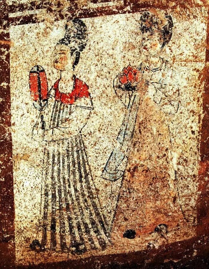 唐代,新城公主墓壁画。这些拿扇子的侍女只是那一群侍女队伍里的一员。