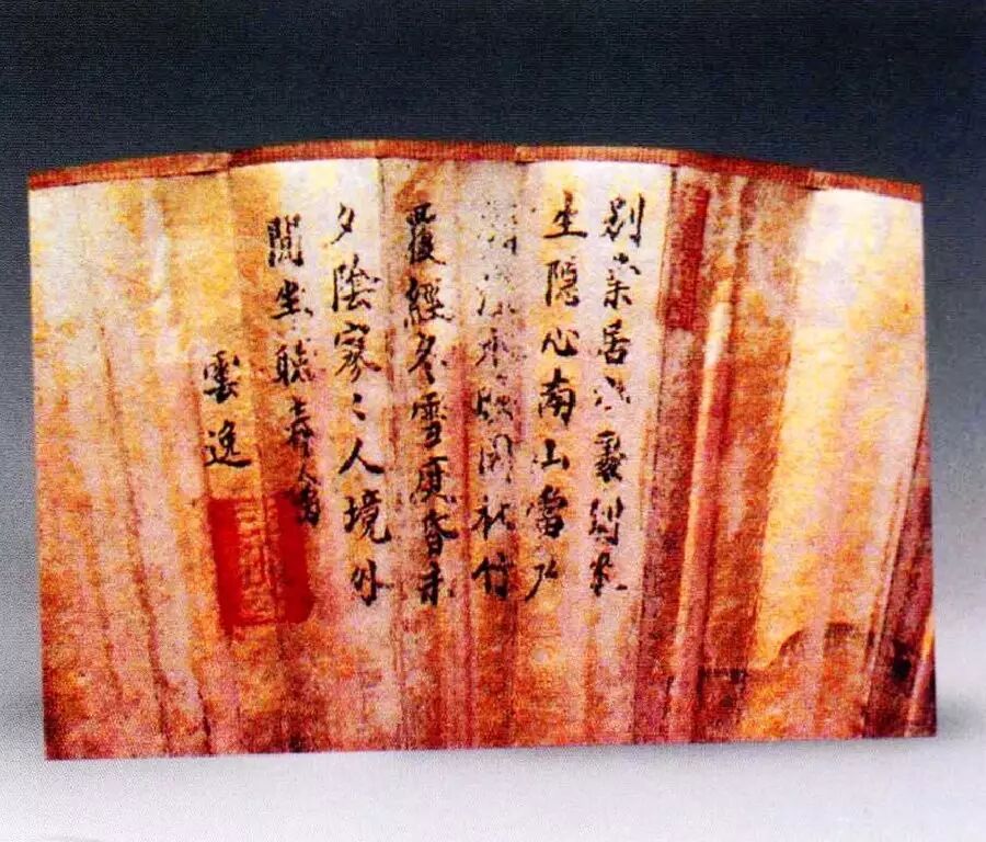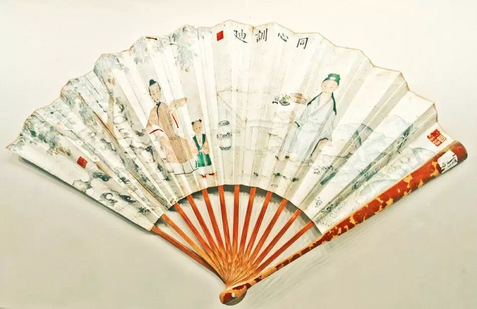 明代折扇大多出自墓葬,并且男女都有。有完整的已经难得了,上面的图案墨迹细看已经有了损失。仍然看得出明代折扇的书画更接近于文人画,素雅大方。更具有明代特色的折扇图案,莫过于十分有现代感的几何图案扇子!