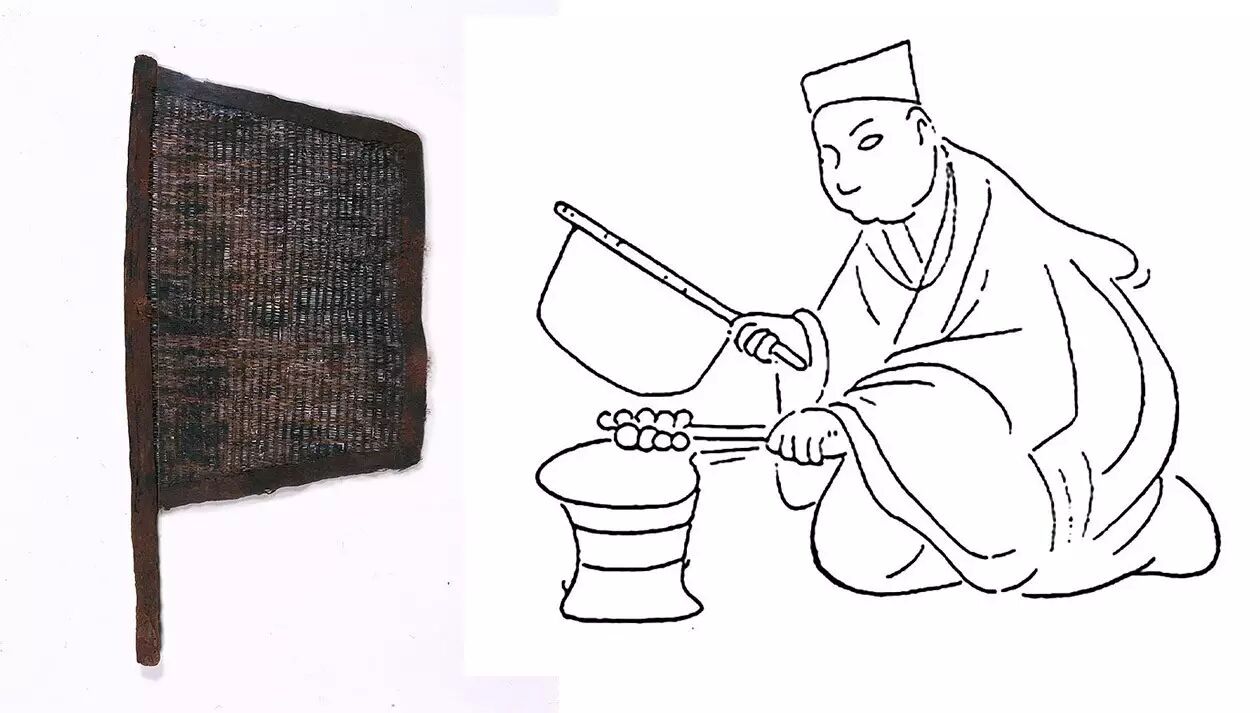 西汉,小竹扇。1972年长沙马王堆一号汉墓出土,柄长52、扇面宽22厘米;东汉,画像石上炙肉奴仆用便面扇火图摹本。
