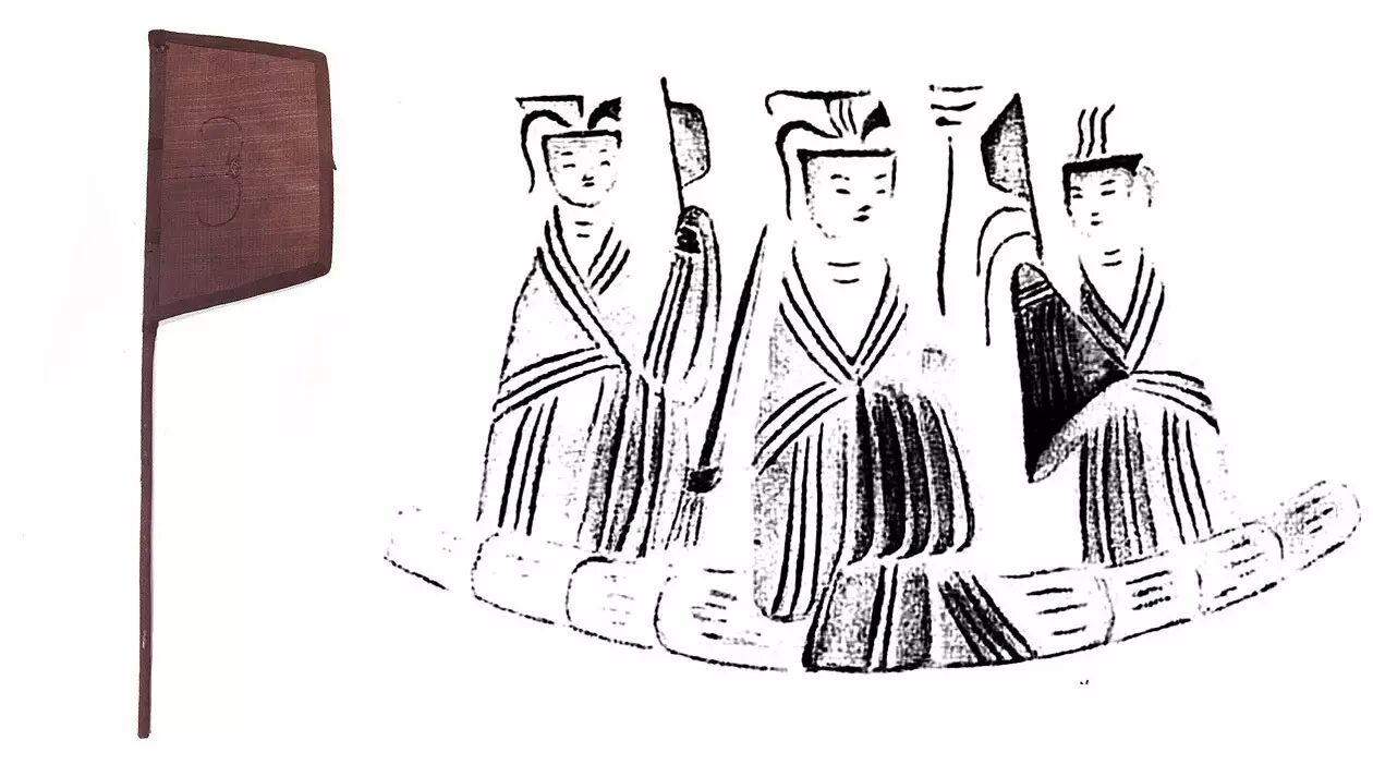 西汉,长柄大竹扇,1972年长沙马王堆一号汉墓出土,柄长176厘米、扇面宽45厘米;三国,三国,西王母铜镜的部分拓本。