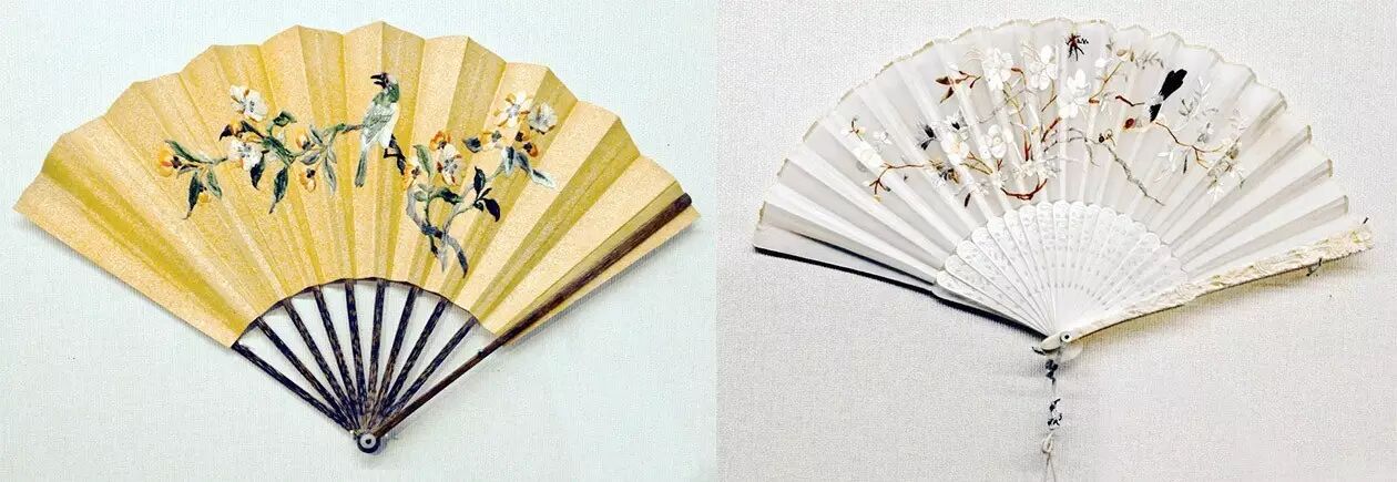 “绣绘”《海棠花鸟图》折扇;“纱绣”《花鸟图》折扇