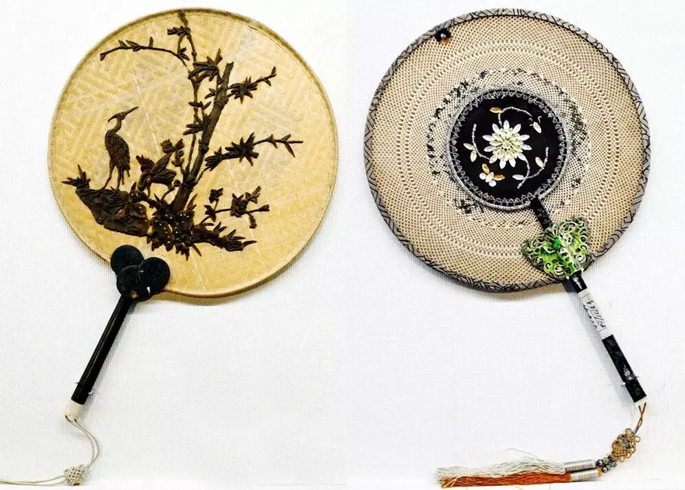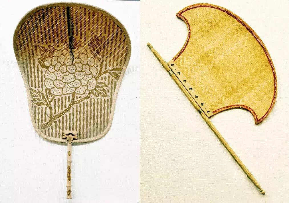 “细竹编织”《牡丹图》竹柄扇;蒲席斧式木柄扇。
